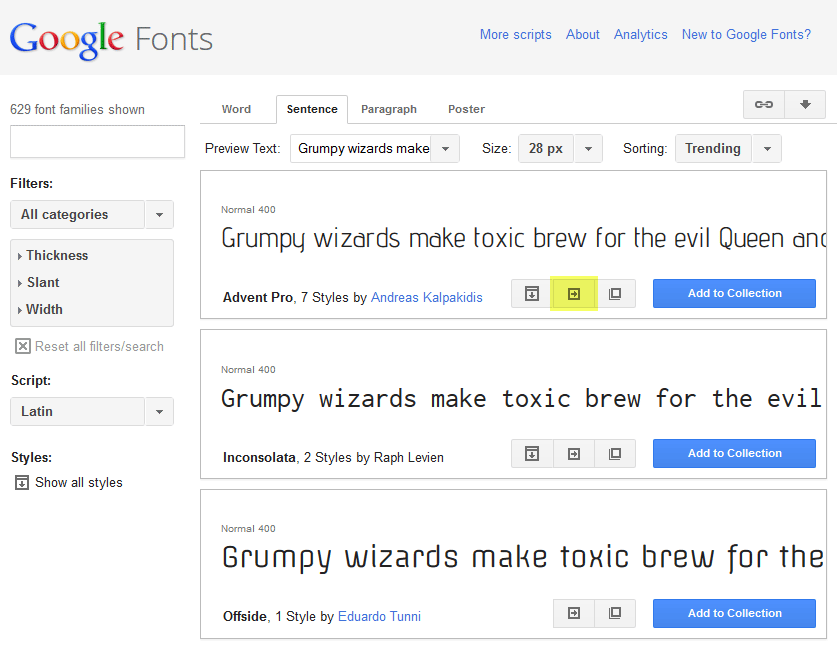Choose the font you want from Google library and press Quick-use.