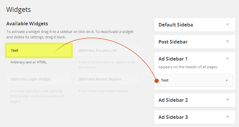 Browse sidebars and find one you want to use as ad holder. Drug and drop standard Text Widget on the sidebar.