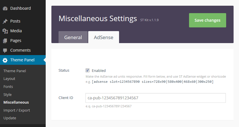With WordPress themes like Grimag you can easily add responsive AdSense ad units to your blog or magazine. In order to do this, first enable AdSense option on Theme Panel > Misc > AdSense page, and paste your AdSense client ID.
