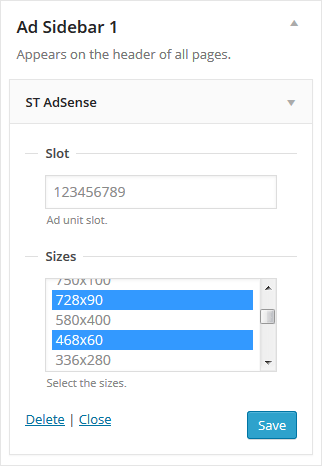 It’s nothing new with widgets usage. Drop ST AdSense widget on sidebar, enter slot ID and select the sizes of ad unit for responsive views and small screen devices.